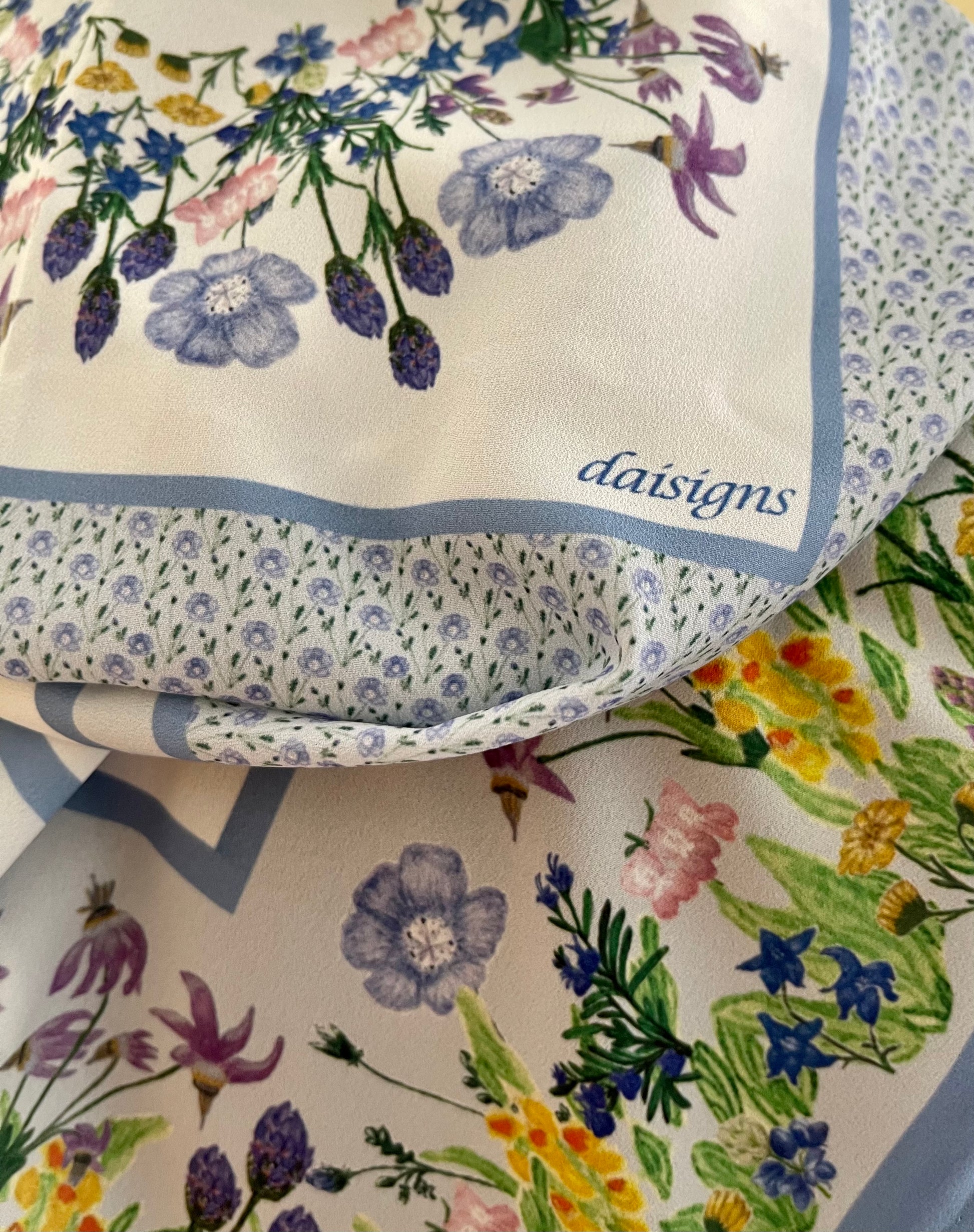 These beautiful botanical scarves use Daisigns original watercolor floral designs and are made and printed in the United States. Each Blue Flower Multi Bouquet scarf measures approximately 36"x36", has a hand rolled edge, and is available in three pastel colors with varying accents and borders, including Light Blue, Light Green, and Light Yellow, as pictured below. The price includes shipping.